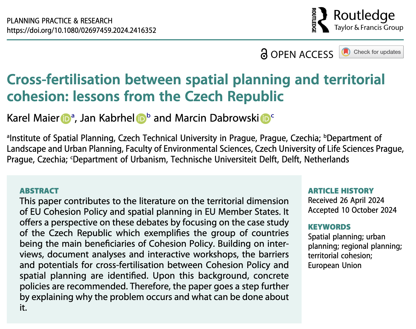 Maier, K., Kabrhel, J., & Dabrowski, M. (2024). Cross-fertilisation between spatial planning and territorial cohesion: lessons from the Czech Republic. Planning Practice & Research, 1–21. https://doi.org/10.1080/02697459.2024.2416352