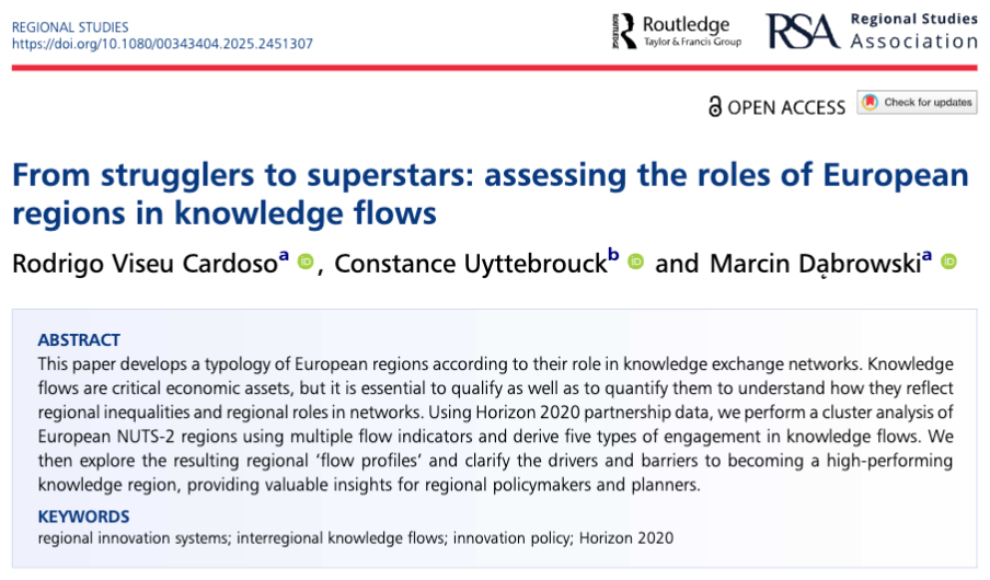 Our new paper explores the clusters of European regions according to their role in knowledge exchange networks (Horizon 2020). In the paper, co-authored by Rodrigo Viseu Cardoso, Constance Uyttebrouck and myself, we identify five regional ‘flow profiles’ and shed light on the drivers and barriers to becoming a high-performing knowledge region from the perspective of engagement in European knowledge flows. On that basis, we highlight some key lessons for regional innovation policy. The paper is based on research conducted as part of the ESPON IRiE project.