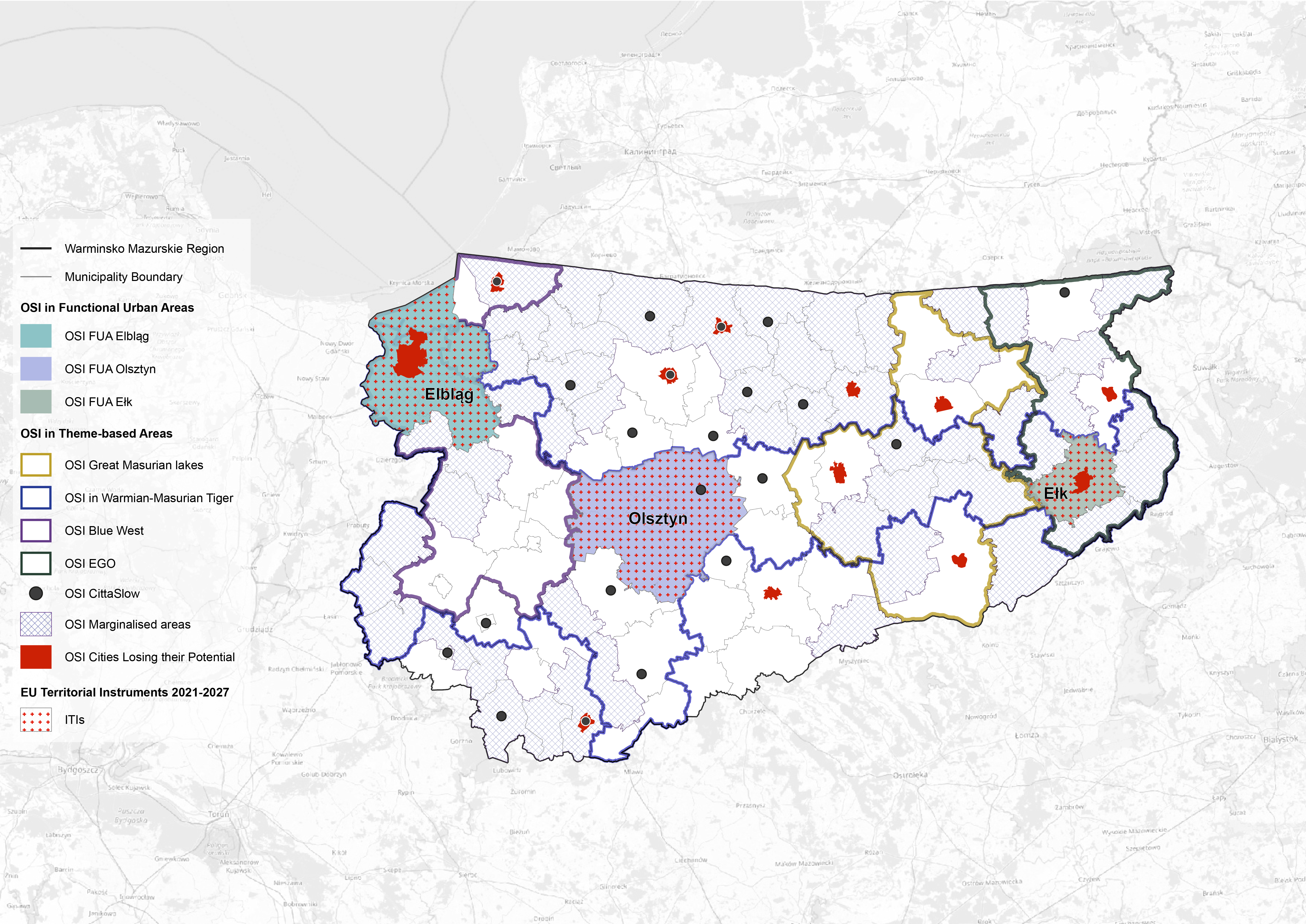 Draft map showing the territorial coverage of Areas of Strategic Intervention (OSI) in Warminsko-Mazurskie region in Poland (prepared by Megha Sahu).